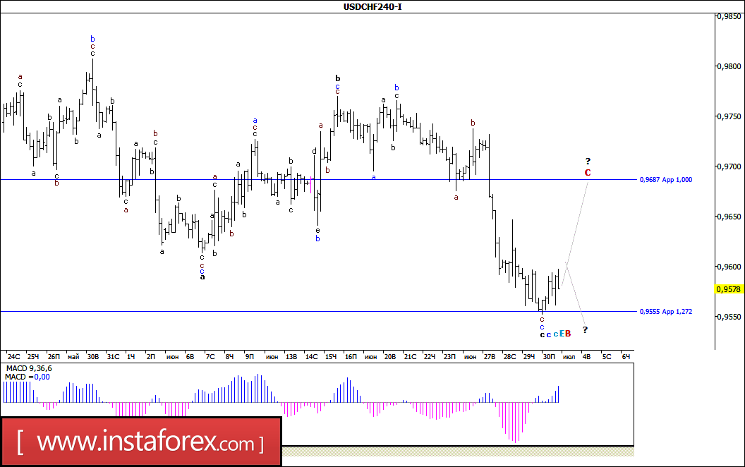 Волновая разметка предполагает построение понижательной волны с, в с, в Е, в В, которая усложнила свою структуру. Таким образом, сейчас ожидается понижение котировок в рамках этой волны с целями, расположенными около отметки 0,9555, что соответствует 127,2% по Фибоначчи, и ниже около 95 фигуры. После завершения волны Е, в В ожидается протяженный рост инструмента в рамках волны С. Неудачная попытка прорыва отметки 0,9555 привела к отходу котировок от достигнутых минимумов.