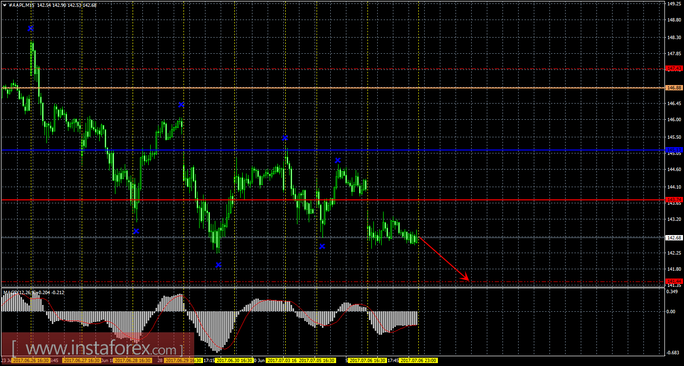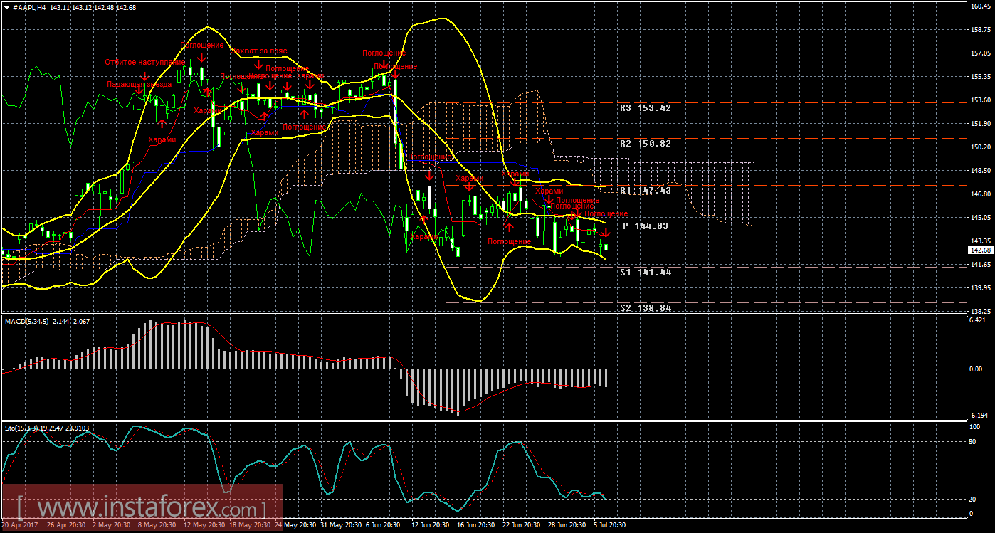 Цена акций Apple продолжает слабое движение вниз. На текущем графике сейчас рекомендуется рассматривать короткие позиции с целью 141,44 и второй целью 138,84. Закрывать вручную ордера на продажу можно будет при отскоке цены от первого таргета, в случае разворота индикатора MACD наверх или при формировании бычьей свечной модели (с подтверждением). Стоп-лосс при торговле на понижение выставляем выше критической линии 145,13. Длинные позиции сейчас не актуальны.