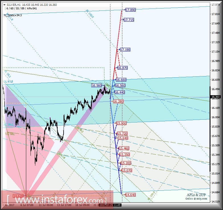 Развитие движения цены инструмента (Silver Spot) в период 25 июля - 01 августа 2017 г. будет обусловлено отработкой границ зоны равновесия (15.900 <-> 16.280 <-> 16.660) вил операционного масштаба Minuette.