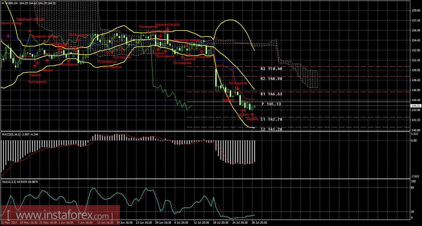 Цена акций IBM продолжает движение вниз. На текущем графике рекомендуется рассматривать шорты с целями 144,24 и 141,48. Стоп лосс рекомендуется выставлять выше критической линии (149,10). Закрывать вручную ордера на продажу можно будет при развороте индикатора MACD наверх (при параллельном повышении цены), при формировании бычьей модели (с подтверждением), а также при отскоке от уровня 144,24. Длинные позиции на данный момент не актуальны.