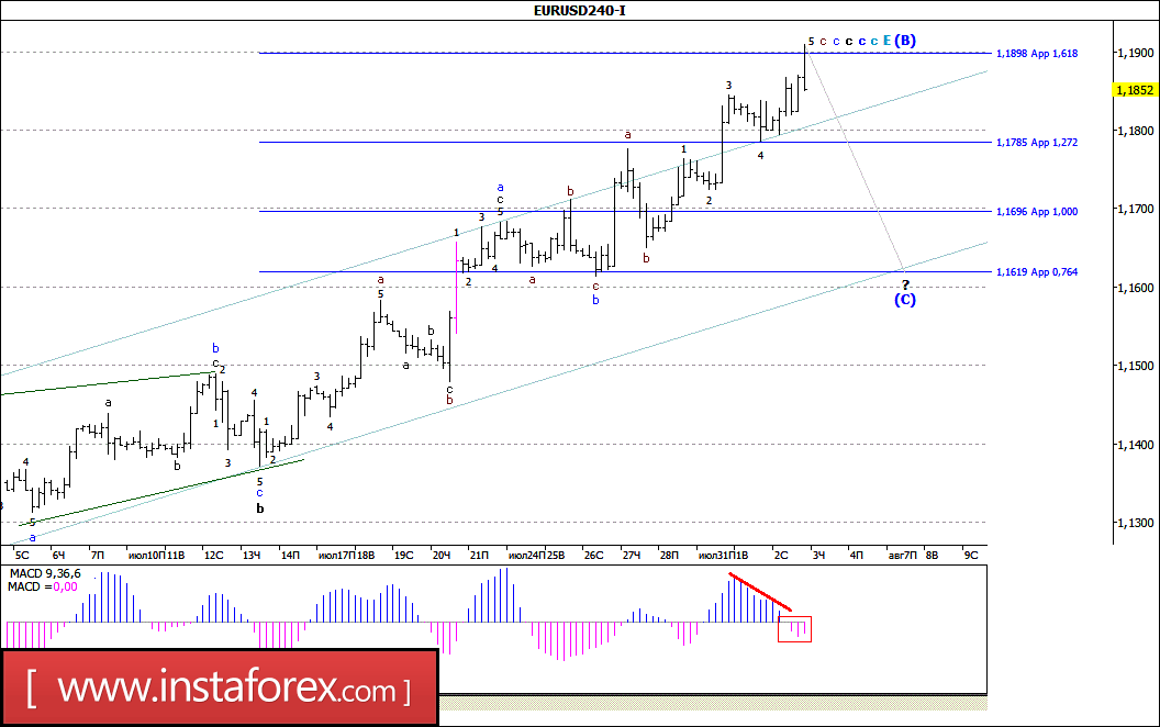 В ходе вчерашних торгов пара EUR/USD все же продолжила восходящее движение и только после пробоя уровня 19-й фигуры откатилась к отметке 1,1850. При этом внутренняя волновая структура всей волны с, в с, в с, в Е, в (В), приняла еще более сложный, но в то же время вполне завершенный вид. Если это так, то от максимума минувшего дня валютная пара может перейти в стадию формирования будущей волны (С) главного понижающего тренда, на что также указывает перешедший в отрицательную зону MACD_ак.