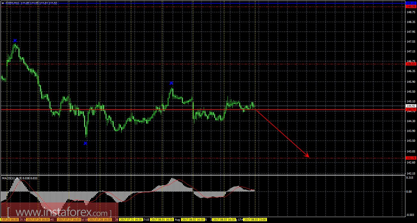 На младшем графике рекомендуется рассматривать ордера на продажу с целью 142,78 при закреплении цены ниже 144,77 (Тенкан-сен) и уровнем S/L выше 144,77 и при направленном вниз MACD.