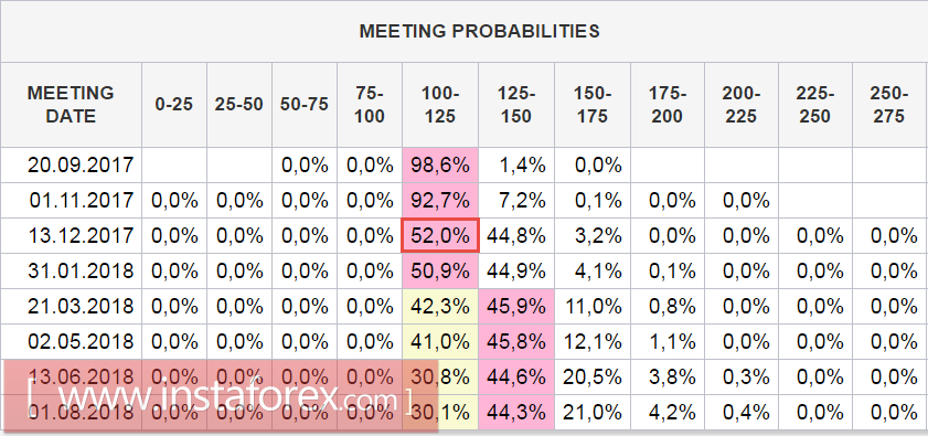 Таким образом, макроэкономические данные сыграли в пользу быков по доллару. Техническая перепроданность и завершение недели дополнили картину, спровоцировав фиксацию прибыли. В то же время уверенности в том, что разворот по доллару состоялся, не прибавилось, во всяком случае прогноз по ставке от СМЕ по-прежнему дает 52%-ю вероятность того, что ФРС по итогам года так и не поднимет ставку, ограничившись запуском программы сокращения баланса.