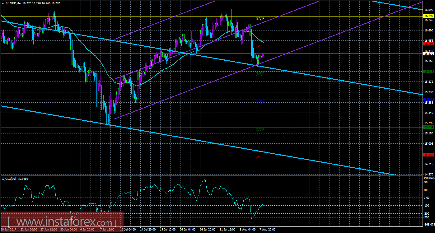Исходя из анализа серебра 8 августа следует, что цена начала восходящую коррекцию с целью скользящая средняя линия. Старший канал направлен вниз, что свидетельствует о нисходящем направлении движения глобального тренда. Младший канал направлен наверх, что означает восходящую тенденцию в краткосрочном плане. В данный момент цена находится ниже мувинга и ниже уровня Мюррея «6/8», что делает более вероятным продолжение нисходящего движения. Первой целью для движения вниз сейчас является уровень Мюррея «5/8» - 16,016. Если цена преодолеет этот уровень, то новой целью будет выступать уровень Мюррея «4/8» - 15,625. Скользящая средняя линия направлена вниз, а цена располагается ниже нее, что сигнализирует о текущем нисходящем уклоне. Ордера на покупку теперь можно будет рассматривать только после закрепления цены выше мувинга. Хайкен Аши окрасил последние бары в фиолетовый цвет, что сигнализирует о текущем движении вверх, поэтому до разворота индикатора вниз, что просигнализирует об окончании коррекции, ордера на продажу не доступны для открытия. Индикатор CCI находится около уровня -100, что сигнализирует о слабой перепроданности инструмента.