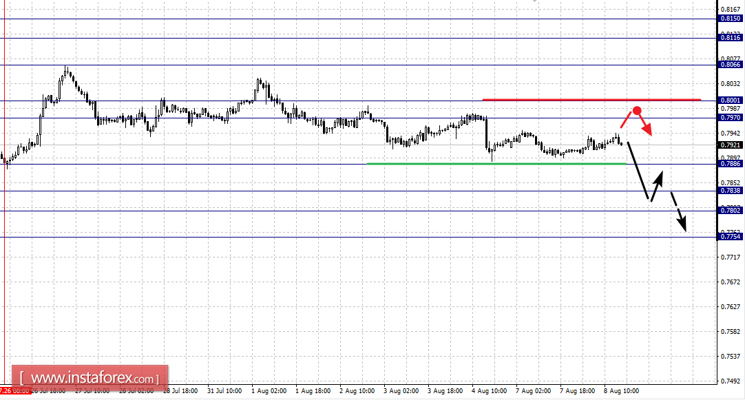 Краткосрочное восходящее движение возможно в коридоре 0.7970 – 0.8001, пробой последнего значения приведет к развитию восходящей структуры, здесь первая цель – 0.8066. В качестве потенциального значения для верха пока рассматриваем уровень 0.8150.