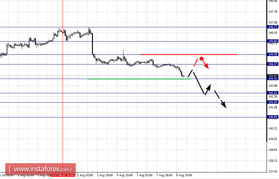 Краткосрочное восходящее движение возможно в коридоре 144.37 – 144.99, пробой последнего значения приведет к углубленной коррекции, здесь цель – 145.85, этот уровень является ключевой поддержкой для нисходящей структуры от 2 августа, его пробой будет располагать к формированию потенциала для восходящего цикла, в данном случае цель – 146.77.