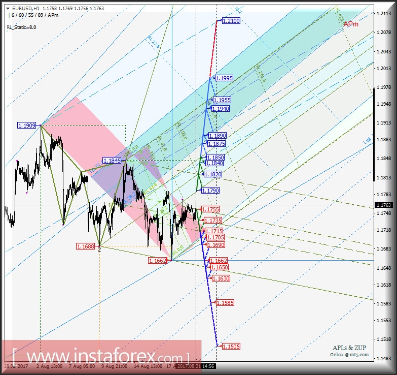 EUR/USD h1. Варианты развития движения с 22 августа 2017 г. Анализ APLs & ZUP