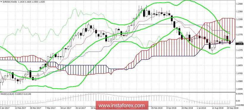 С технической точки зрения пара евро-доллар подошла к важному уровню поддержки 1.1520 (нижняя граница облака Kumo на месячном графике). Если медведи продавят данную отметку, то следующим уровнем поддержки будет уже отметка 1.1440 (нижняя линия индикатора Bollinger Bands на W1).