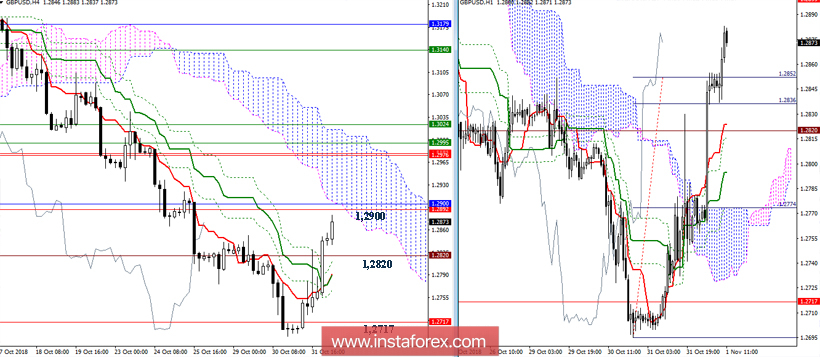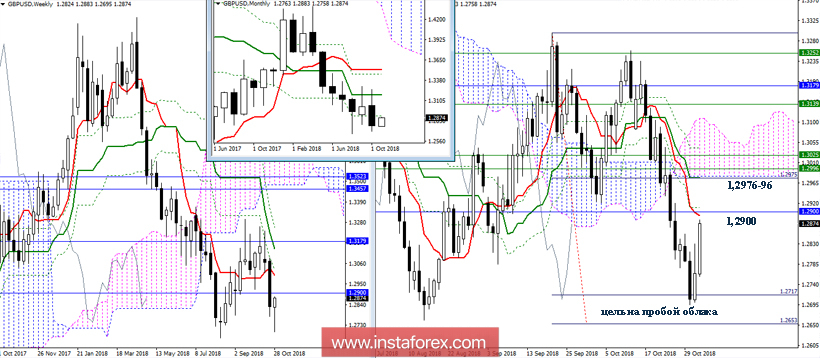 Игроки на повышение активно и настойчиво меняют распределение сил. К настоящему моменту осталась позади цель на пробой облака Н1. Сейчас основной интерес сосредоточен на сопротивлении облака Н4. Его границы усилены уровнями старших таймов и формируют следующие зоны сопротивлений – 1,2892-1,2900 и 1,2976-1,3024.