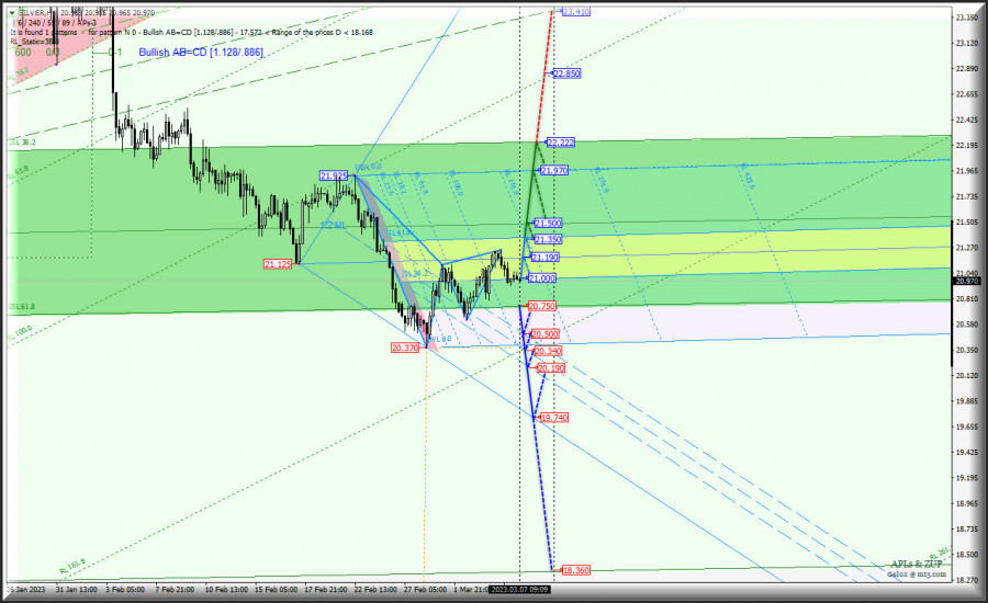 Развитие движения Spot Silver-h4 c 08 марта 2023 г. продолжится в границах зон равновесия вил операционных масштабов - Minute-h4 (20.750 - 21.500 - 22.222) и Minuette-h1 (21.000 - 21.190 - 21.350) в соответствии с направлением пробоя диапазона: