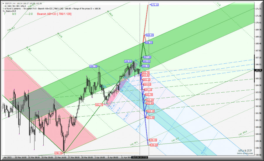 А развитие движения GBP/JPY-h4 с 17 апреля 2023 г. будет обусловлено границами зоны равновесия (168.55 - 167.20 - 165.75) вил старшего операционного масштаба MInute-h4 и продолжится в зависимости от направления пробоя диапазона::