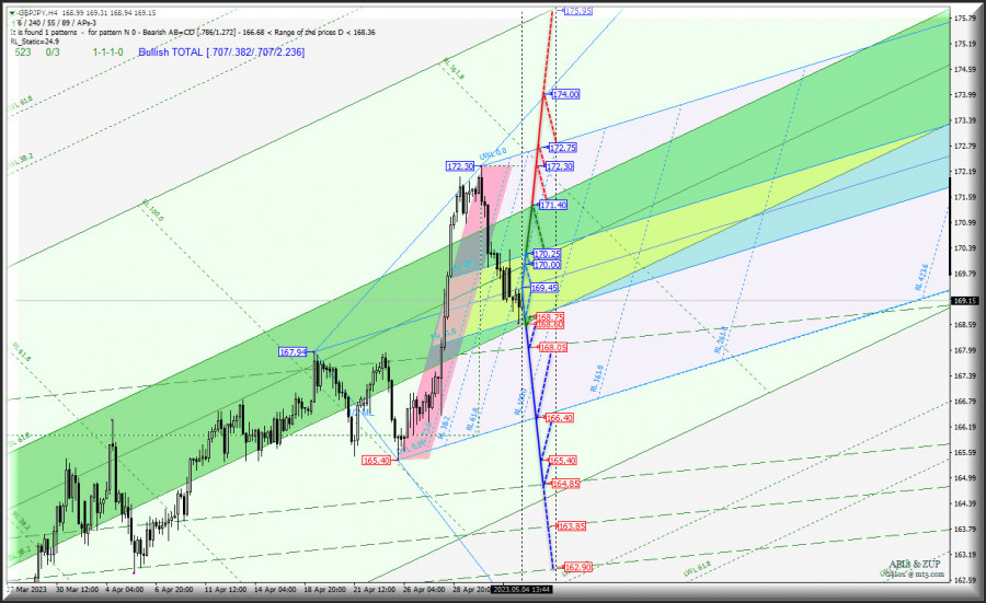 А развитие движения GBP/JPY-h4 с 5 мая 2023 г. продолжится в зоне равновесия (168.60 - 170.00 - 171.40) вил старшего операционного масштаба Minute-h4 с учетом отработки и направления пробоя границ зоны равновесия (168.75 - 169.45 - 170.25) вил младшего операционного масштаба Minuette-h1.