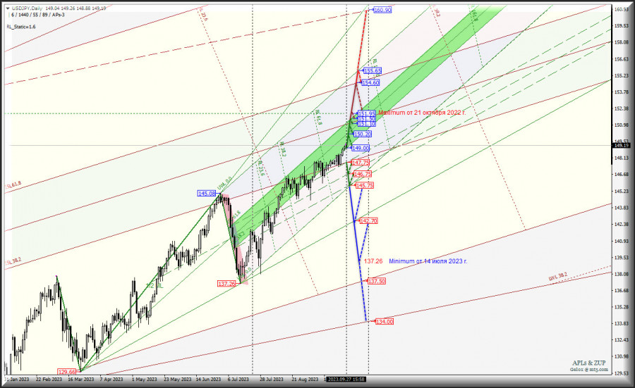 USD/JPY-Daily в октябре 2023 г. , с определенной долей вероятности, продолжит свое движение в зоне равновесия (154.60 - 151.10 - 147.75) вил старшего операционного масштаба Minor-Daily в зависимости от направления пробоя диапазона: