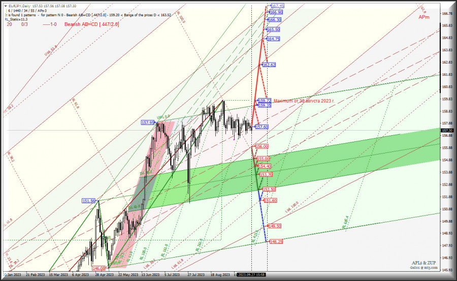 Развитие движения EUR/JPY-Daily в октябре 2023 г. скорее всего продолжится в канале 1/2 Median Line (157.60 - 156.00 - 154.40) вил старшего операционного масштаба Minor-Daily в зависимости от направления пробоя диапазона: