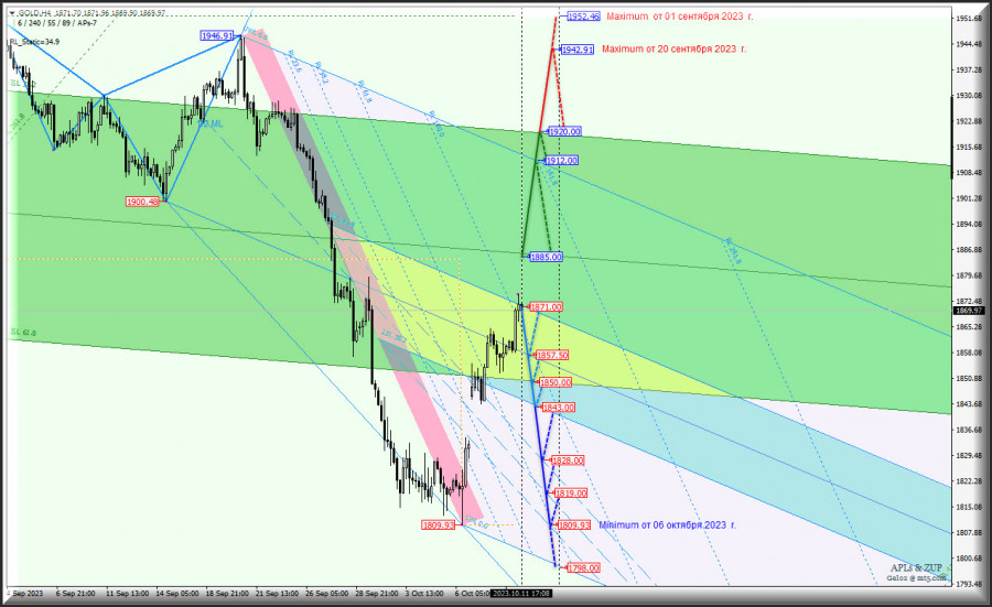 Spot Gold-h4 с достаточной долей вероятности с 12 октября 2023 г. продолжит свое движение в зонах равновесия вил операционных масштабов - Minute-h4 (1850.00 - 1885.00 - 1920.00) и Minuette-h1 (1843.00 - 1857.50 - 1871.00) в зависимости от отработки и направления пробоя диапазона: