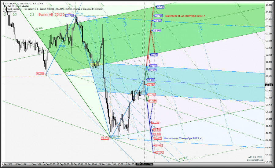 Дальнейшее развитие движения Spot Silver-h4 c 12 октября 2023 г. станет проистекать в границах канала 1/2 Median Line (21.570 - 21.980 - 22.350) вил старшего операционного масштаба Minute-h4 и зоны равновесия (21.730 - 22.100 - 22.450) вил младшего операционного масштаба Minuette-h1 в соответствии с отработкой и направлением пробоя диапазона: