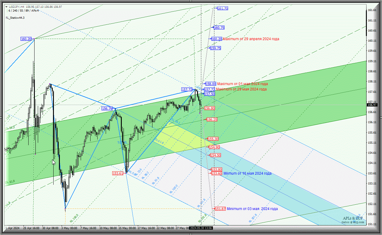 Движение USD/JPY-h4 с 31 мая 2024 года продолжает оставаться в зоне равновесия (157.50 - 156.25 - 154.90) вил старшего операционного масштаба Minute-h4, а направление данного движения будет определяться отработкой и направлением пробоя диапазона: