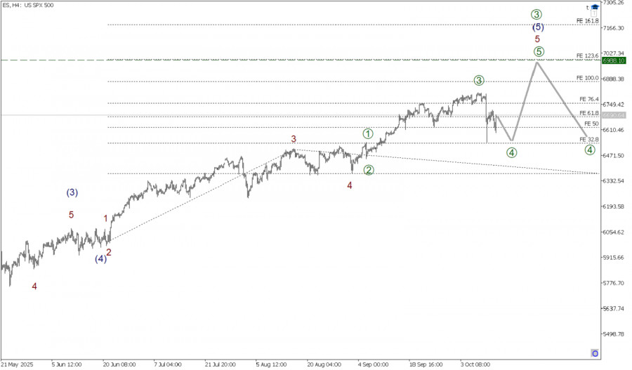 В глобальной перспективе по индексу SP500 может формироваться крупный импульс (1)-(2)-(3)-(4)-(5). Подволна (1) и (2) сформированы. На последнем участке графика представлена восходящая импульсная волна (3), размеченная подволнами 1-2-3-4-5. В составе волны (3) завершенными смотрятся подволны 1-2-3-4. Коррекционная волна 4 не так давно подошла к концу и приняла форму двойного зигзага. На последнем участке цены мы можем наблюдать построение новой и финальной волны 5. Волна 5 может принять форму импульса [1]-[2]-[3]-[4]-[5]. Завершены подволны [1]-[2], и сейчас растем в более мощной подволне [3]. Вероятно, быки нацелены на предыдущий максимум 6864, на указанном уровне величина импульса 5 будет равна 100% по расширению Фибоначчи от волны 3. В текущей ситуации можно рассматривать открытие длинных позиций с целью забрать прибыль на завершении импульсного роста в районе предыдущего максимума.