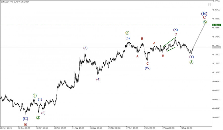 Рынок по Евродоллару в долгосрочной перспективе может формировать крупную бычью коррекция (B), которая принимает форму стандартного зигзага A-B-C. На сегодняшний день полностью завершены только первые две его части - импульс A и коррекция B. На последнем участке графика мы можем наблюдать развитие бычьей волны C, которая, по всей видимости, принимает форму импульса. На текущий момент завершены первые четыре его части - подволны [1]-[2]-[3]-[4]. В процессе построения ,бычья финальная подволна [5]. Большая вероятность, что быки внутри волны [5] смогут отправить рынок в область уровня 1.219. На указанной отметке величина крупной импульсной волны [5] составит 50% по расширению Фибоначчи от предыдущей импульсной волны [3]. Таким образом, при продолжении роста, стоит рассмотреть открытие длинных позиций с текущего уровня, с целью забрать прибыль на указанной отметке. После достижения уровня 1.219, ожидается смена тренда, а именно ожидается развитие финального медвежьего импульса (C). В текущей ситуации рекомендуется рассматривать открытие длинных позиций.