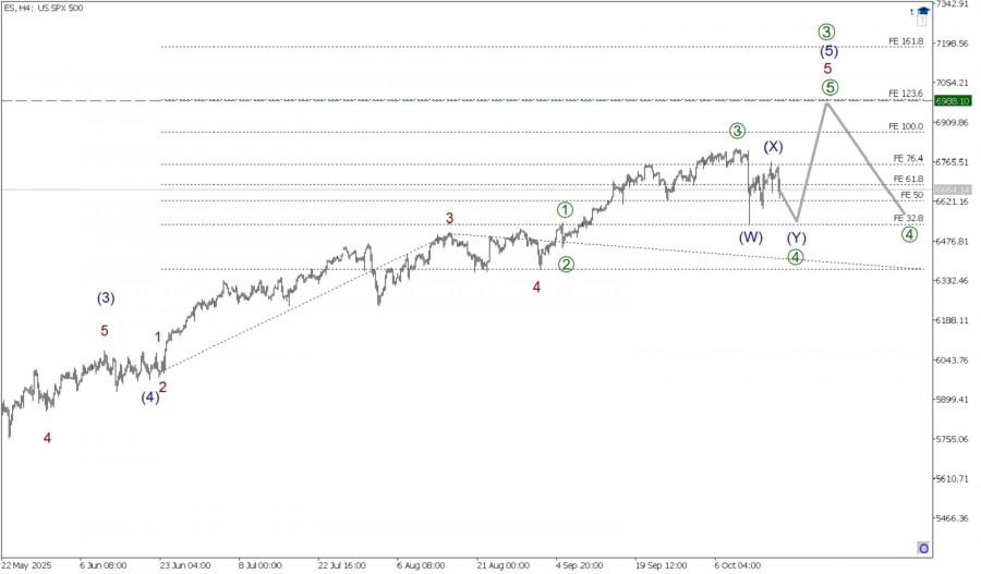 В глобальной перспективе по индексу SP500 может формироваться крупный импульс (1)-(2)-(3)-(4)-(5). Подволна (1) и (2) сформированы. На последнем участке графика представлена восходящая импульсная волна (3), размеченная подволнами 1-2-3-4-5. В составе волны (3) завершенными смотрятся подволны 1-2-3-4. Коррекционная волна 4 не так давно подошла к концу и приняла форму двойного зигзага. На последнем участке цены мы можем наблюдать построение новой и финальной волны 5. Волна 5 может принять форму импульса [1]-[2]-[3]-[4]-[5]. Завершены подволны [1]-[2], и сейчас растем в более мощной подволне [3]. Вероятно, быки нацелены на предыдущий максимум 6864, на указанном уровне величина импульса 5 будет равна 100% по расширению Фибоначчи от волны 3. В текущей ситуации можно рассматривать открытие длинных позиций с целью забрать прибыль на завершении импульсного роста в районе предыдущего максимума.