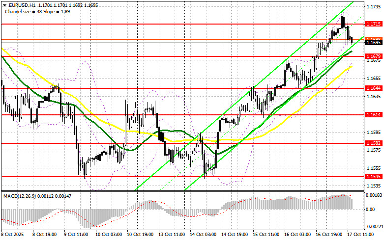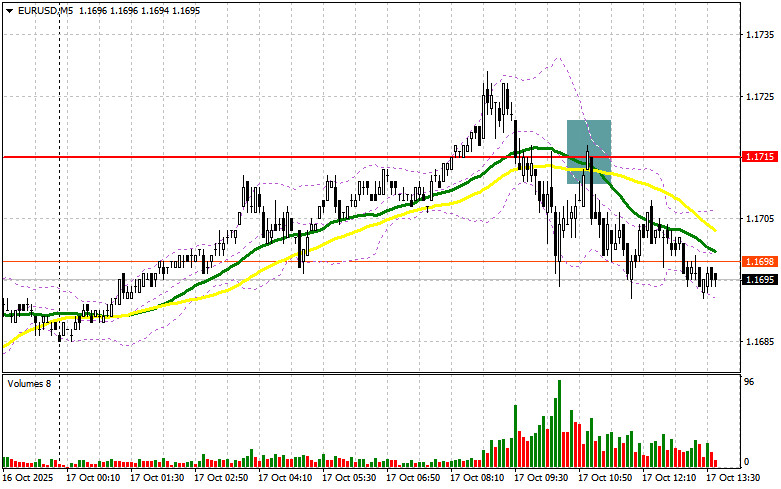В своем утреннем прогнозе я обращал внимание на уровень 1.1715 и планировал от него принимать решения по входу в рынок. Давайте посмотрим на 5-минутный график и разберемся с тем, что там произошло. Рост и формирование ложного пробоя в районе 1.1715 привели к точке входа на продажу евро, что вылилось в падение пары на 25 пунктов. На вторую половину дня техническая картина не пересматривалась.