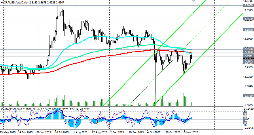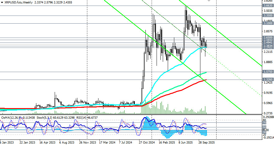 С технической же точки зрения XRP/USD, несмотря на недавнее снижение, продолжает торговаться в зоне долгосрочного бычьего рынка, значительно выше ключевых уровней поддержки 1.5750 и 1.3260 (144- и 200-периодная скользящие средние на недельном графике) и даже выше важного среднесрочного уровня поддержки 2.3400 (50-периодная скользящая средняя на недельном графике). В целом, сохраняется позитивная динамика. Пробой сильной зоны сопротивления вокруг ключевых уровней 2.6500 и 2.5850 (144- и 200-периодная скользящие средние на дневном графике) подтвердит также возврат цены и в зону среднесрочного бычьего рынка, создав предпосылки для дальнейшего роста в сторону рекордных максимумов, зафиксированных в июле выше отметки 3.6600. Пробой уровня сопротивления 2.4940 может стать в этом случае первым сигналом для возобновления покупок XRP/USD.