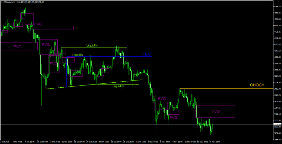 Эфир на дневном ТФ продолжает формирование новой нисходящей тенденции. В ходе обвала в «черную пятницу» был отработан один из последних «бычьих» FVG, а в ходе «черного вторника» был отработан следующий «бычий» FVG. Новый виток падения начался после идеальной реакции на ближайший «медвежий» FVG, а в ходе самого падения был сформирован еще один «медвежий» FVG. Структура тенденции в данное время понятна, как день, и не вызывает никаких вопросов. Снизу также остается очевидная цель – следующий «бычий» FVG, который был сформирован в ходе последнего восходящего тренда. Линия CHOCH проходит по уровню 4 250$. До тех пор, пока цена находится ниже него, нисходящий тренд сохраняется.