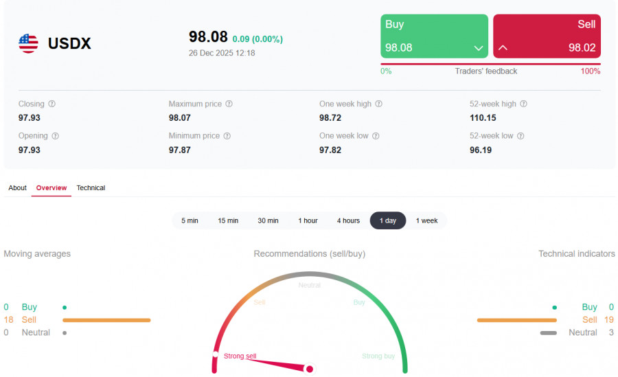 *) см. также: Торговые индикаторы InstaForex по USDXВ конце сокращенной рождественской недели, которая также является последней полной торговой неделей месяца и уходящего года, доллар США демонстрирует некоторую восходящую коррекцию, в целом оставаясь под давлением.Так, на момент публикации данной статьи, индекс доллара USDX находился вблизи отметки 98.00, чуть ниже внутридневного максимума 98.07 и ниже ближайшего важного краткосрочного уровня сопротивления 98.27 (ЕМА200 на 1-часовом графике USDX). Все говорит о том, что эту неделю и месяц индекс доллара USDX закроет на негативной территории.