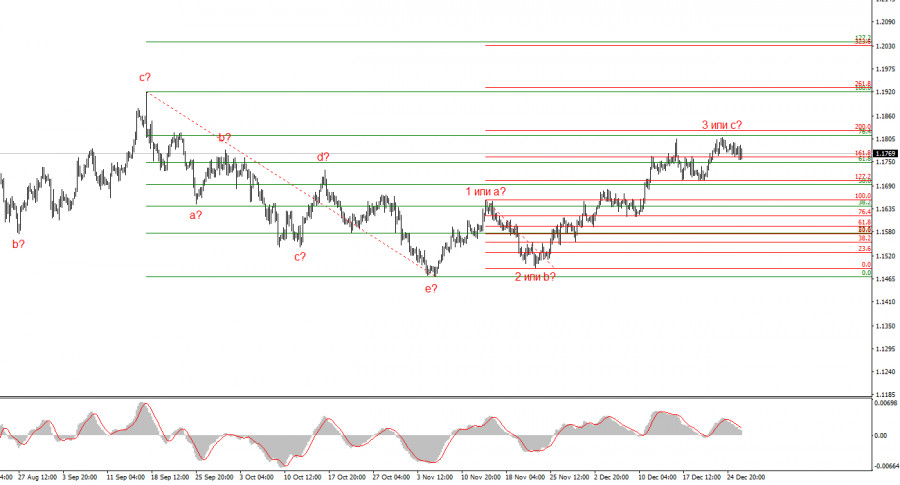 Волновая разметка 4-часового графика для инструмента EUR/USD имеет вполне понятный, хоть и довольно сложный вид. Об отмене повышательного участка тренда, который берет свое начало в январе 2025 года, речи не идет, но волновая структура, начиная с 1 июля, приняла сложный и протяженный вид. На мой взгляд, инструмент завершил построение коррекционной волны 4, которая приняла очень нестандартный вид. Внутри этой волны мы наблюдали исключительно коррекционные структуры, поэтому сомнений в коррекционном характере этой волны не возникает никаких. На мой взгляд, построение