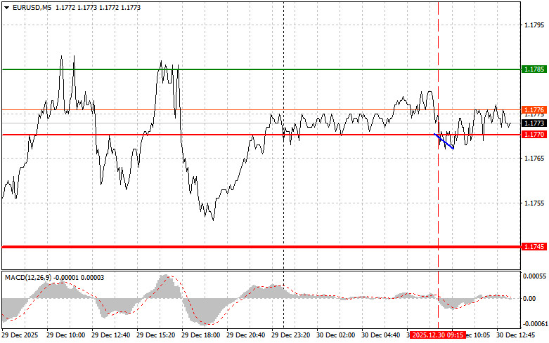 Разбор сделок и советы по торговле европейской валютойТест цены 1.1770 пришелся на момент, когда индикатор MACD только начинал движение вниз от нулевой отметки, что стало подтверждением правильной точки входа на продажу евро. Однако до крупного падения дело так и не дошло.Предпраздничное затишье в Европе отразилось на колебаниях курса EUR/USD, зафиксировав его в пределах ограниченного коридора. Участники рынка, охваченные праздничным настроением, демонстрируют сдержанность, воздерживаясь от активных действий и рискованных сделок. Во второй половине дня внимание привлекут обновленные данные по индексу цен
