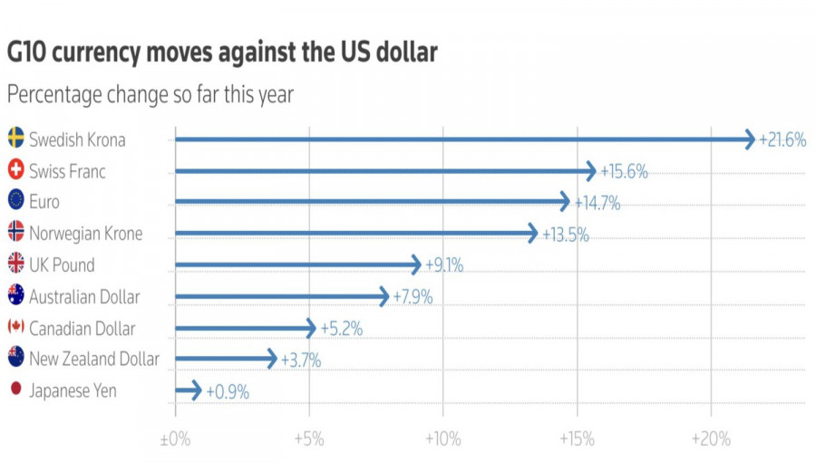 Сможет ли протокол декабрьского заседания FOMC вывести американский доллар из построждественского сна? Ожидается, что важный документ покажет раскол в рядах центробанка. Вряд ли им кого-то можно удивить. Девятью голосами против трех ФРС проголосовала за снижение ставки по федеральным фондам до 3,75%. Как точно отметил Джером Пауэлл, в составе Комитета есть люди, имеющие очень сильные, но противоположные позиции. Это обстоятельство дает возможность Федрезерву перейти в режим «посидим и посмотрим». Динамика валют Большой десятки в 2025От ФРС зависит