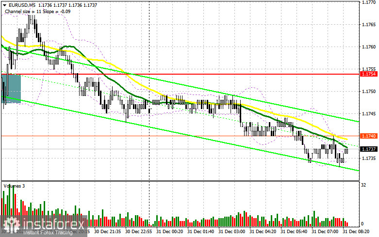 Вера была образована лишь одна точка входа в рынок. Давайте посмотрим на 5-минутный график и разберемся с тем, что там произошло. В своем утреннем прогнозе я обращал внимание на уровень 1.1754 и планировал от него принимать решения по входу в рынок. Снижение евро произошло, но до теста 1.1754 дело так и не дошло, так что я остался без сделок. Во второй половине дня ложный пробой в области 1.1754 позволил войти в длинные позиции, что вылилось в небольшой рост пары на 12 пунктов.