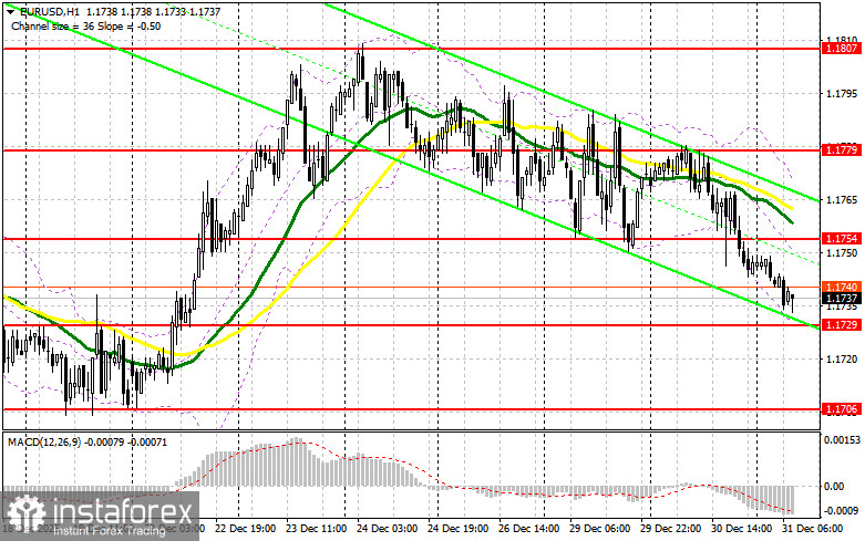 Хорошие данные по росту индекса цен на жилье в США и индекса PMI Чикаго оказали вчера сильную поддержку американскому доллару. Сегодня давление на евро может сохраниться, так как в первой половине дня нет никакой статистики по еврозоне, что может привести к дальнейшему снижению EUR/USD в конце года. В случае падения пары первое проявление покупателей ожидаю увидеть в районе ближайшей поддержки 1.1729, до теста которой дело пока так и не дошло. Только формирование там ложного можно даст точку входа в длинные позиции с целью небольшого восстановления к 1.1754. Прорыв и обратный тест этого диапазона станут подтверждением правильных действий на покупку евро уже в расчете на более крупный рывок к 1.1779. Самой дальней целью выступит максимум 1.1807, где буду фиксировать прибыль. Тест этого уровня вернет бычий рынок по евро. При варианте снижения EUR/USD, и отсутствия активности в районе 1.1729, давление на пару усилится, что может привести к более крупному движению евро вниз. В таком случае медведи попытаются дотянуться до следующего интересного уровня 1.1706. Лишь формирование там ложного пробоя будет подходящим условием на покупку евро. Открывать длинные позиции сразу на отскок будут от 1.1684 с целью восходящей коррекции в 30-35 пунктов внутри дня.