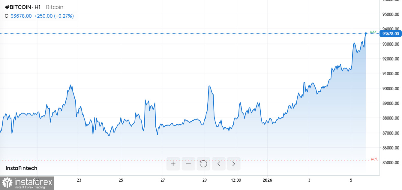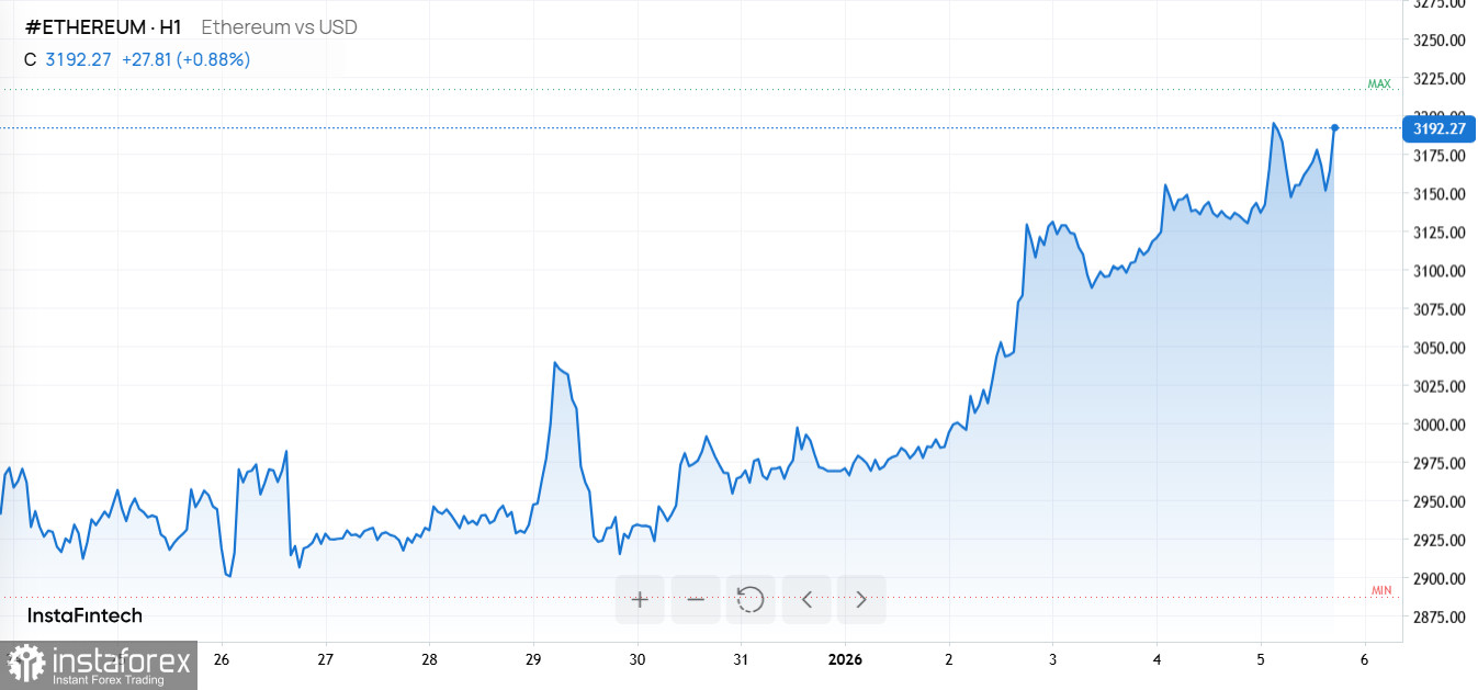 5 января 2026 года Bitcoin взлетел выше отметки в $93 000, достигнув уровня $93 388, показав рост на 6,8% по сравнению с концом декабря. Ethereum не остался в стороне и поднялся выше $3 160, краткосрочно протестировав и уровень $3 220, что дало ему прибавку в 9% с начала года. Таким образом, обе криптовалюты продлили победную серию до пяти торговых сессий подряд.