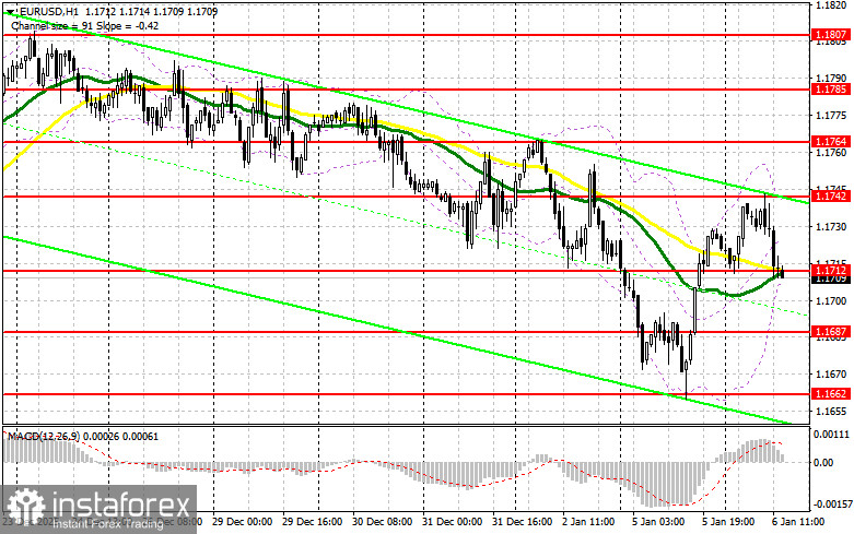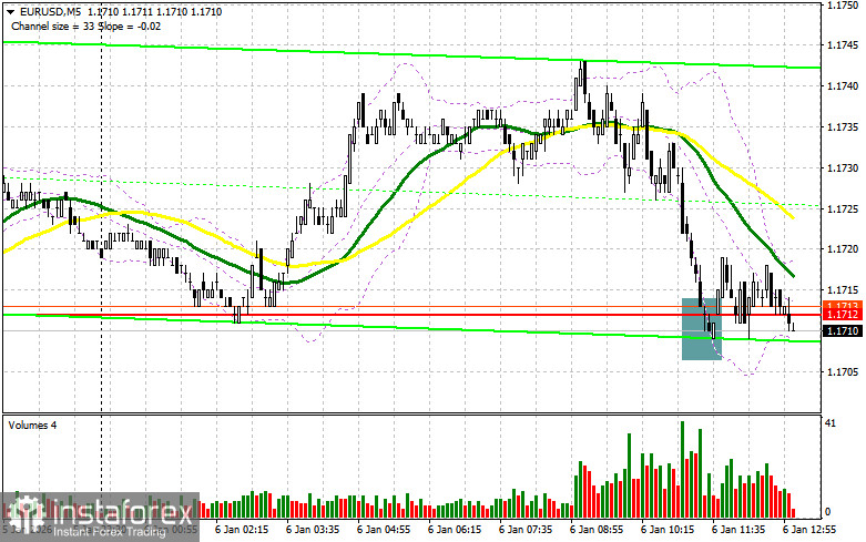 В своем утреннем прогнозе я обращал внимание на уровень 1.1712 и планировал от него принимать решения по входу в рынок. Давайте посмотрим на 5-минутный график и разберемся с тем, что там произошло. Снижение и формирование ложного пробоя в районе 1.1712 привели к точке входа на покупку евро, однако крупного роста пары от этого уровня не произошло. На вторую половину дня техническая картина была пересмотрена.