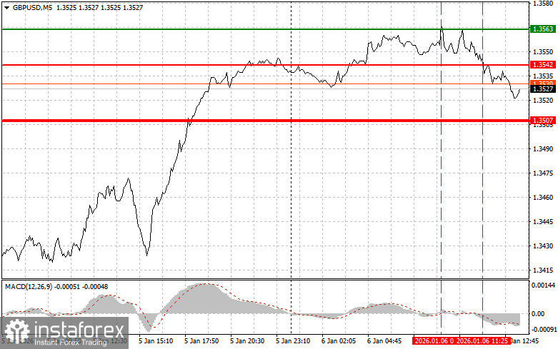 Сценарий №2: покупать фунт сегодня также планирую в случае двух подряд тестов цены 1.3511 в момент, когда индикатор MACD будет находиться в области перепроданности. Это ограничит нисходящий потенциал пары и приведет к обратному развороту рынка вверх. Можно ожидать рост к противоположным уровням 1.3539 и 1.3562.