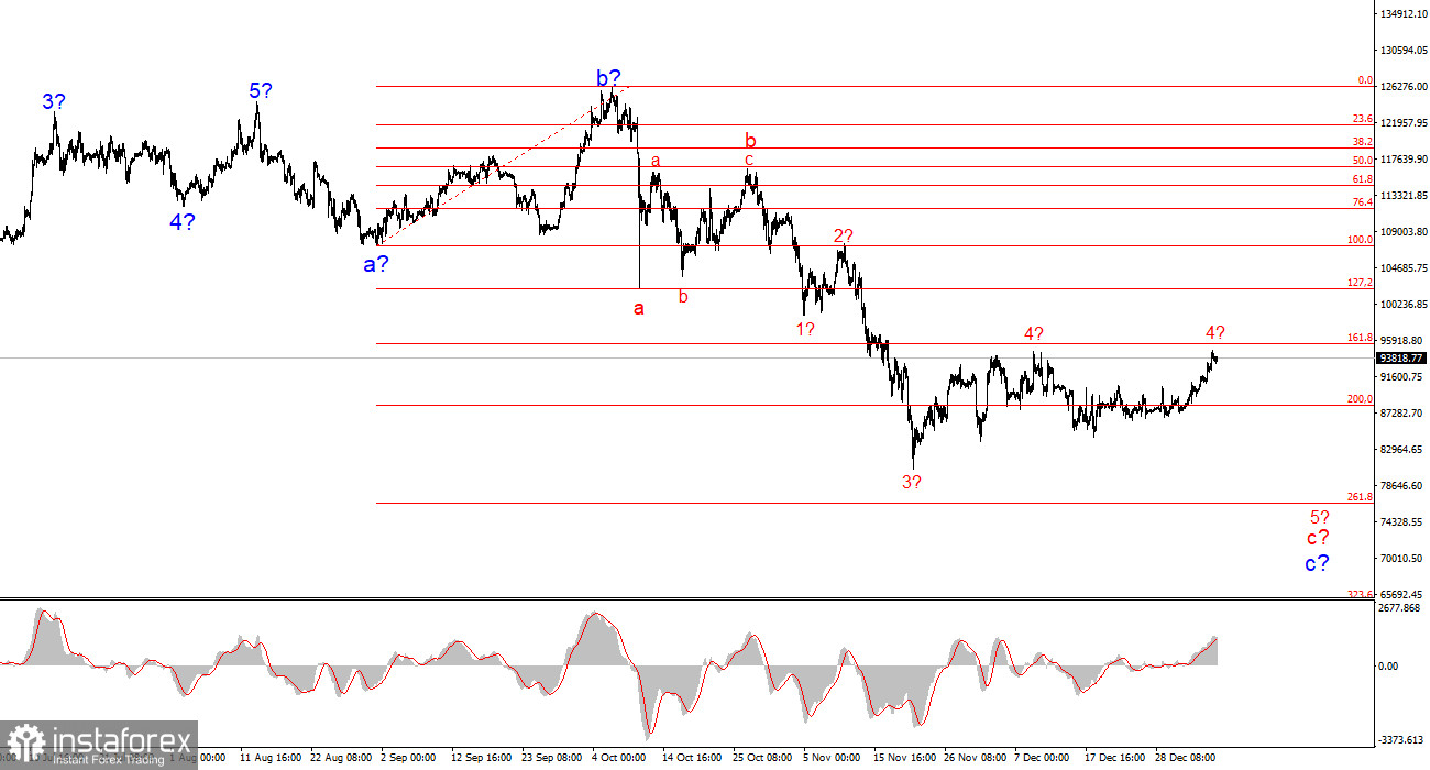 Биткоин предположительно завершил построение коррекционной волны 4, которая приняла вид сужающегося треугольника a-b-c-d-e. Однако в последние несколько дней биткоин повышается, поэтому волна 4 может принять более сложный и протяженный вид. На старшем масштабе продолжает построение коррекционная структура a-b-c, которая легко может трансформироваться в полноценный импульсный участок тренда. Напомню, что пик волны b этой структуры вышел за пик последней волны предыдущего повышательного участка тренда, чего в классическом волновом анализе быть не может. Однако я продолжаю настаивать на том, что нужно быть более гибкими при определении волн и волновых структур. В ближайшее время рынок может начать построение предполагаемой волны 5 в с в с, лоу которой должен находиться ниже отметки 80500$.