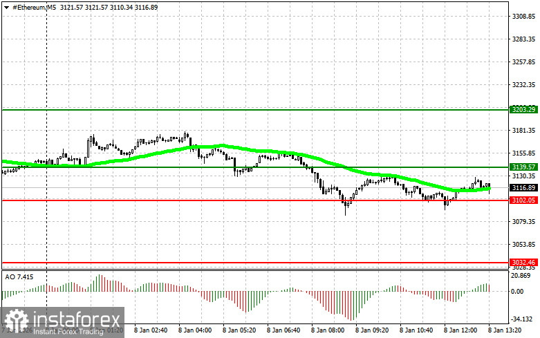 Сценарий №2: покупать эфир можно от нижней границы $3102 при отсутствии рыночной реакции на ее пробой в обратную сторону к уровням $3139 и $3203.