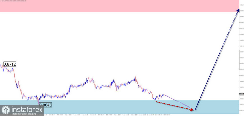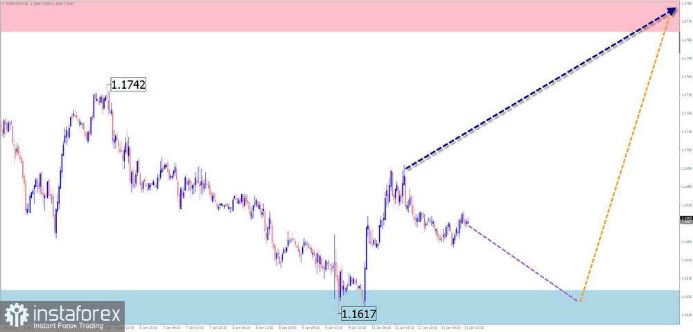В ближайшие дни ожидается продолжение бокового вектора движения евро. После вероятной попытки давления на нижнюю разворотную зону можно ждать смену вектора и подъем цены к зоне сопротивления. При смене направления нельзя исключать кратковременный прорыв нижней границы расчетной поддержки.