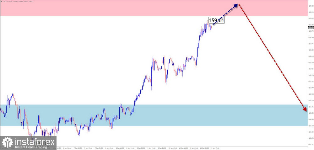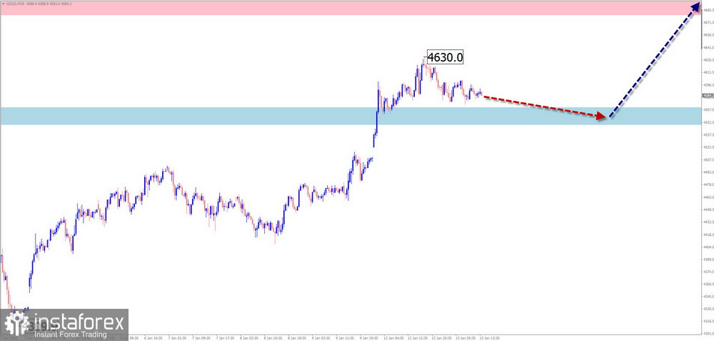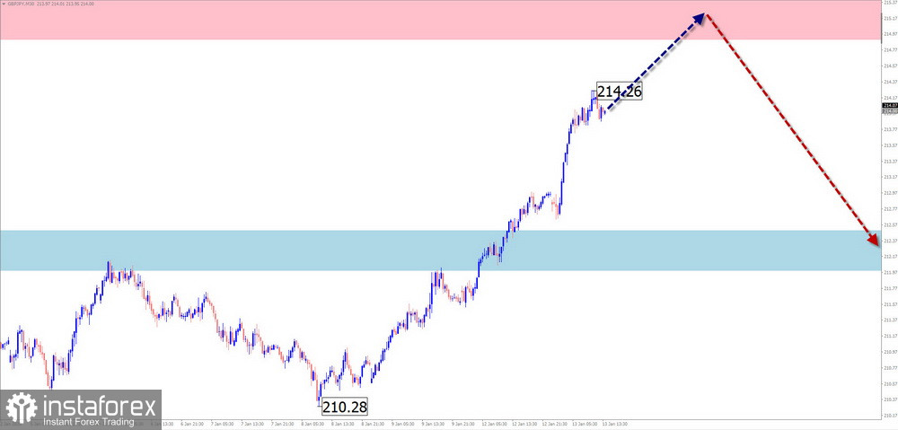 В начале предстоящей недели высока вероятность сохранения общего бокового настроя ценовых колебаний. Нельзя исключать давления на верхнюю границу расчётного сопротивления. С высокой вероятностью далее можно рассчитывать на формирование разворота и начало ценового снижения, вплоть до зоны поддержки.