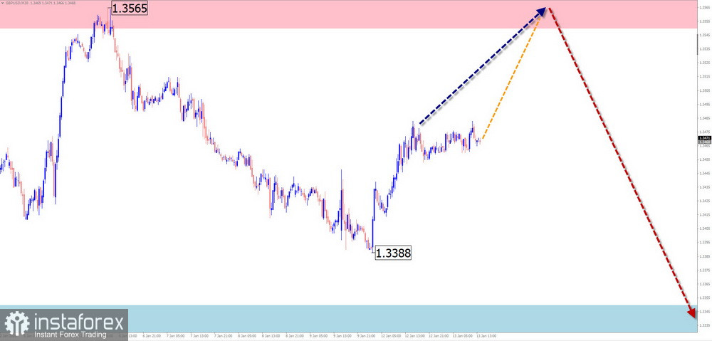 На графике основной пары английского фунта стерлингов направление краткосрочного тренда с начала прошлого года задает алгоритм восходящей волны. В ее структуре на момент анализа развивается откат в рамках заключительной части (С). Котировки приближаются к нижней границе зоны потенциального разворота.