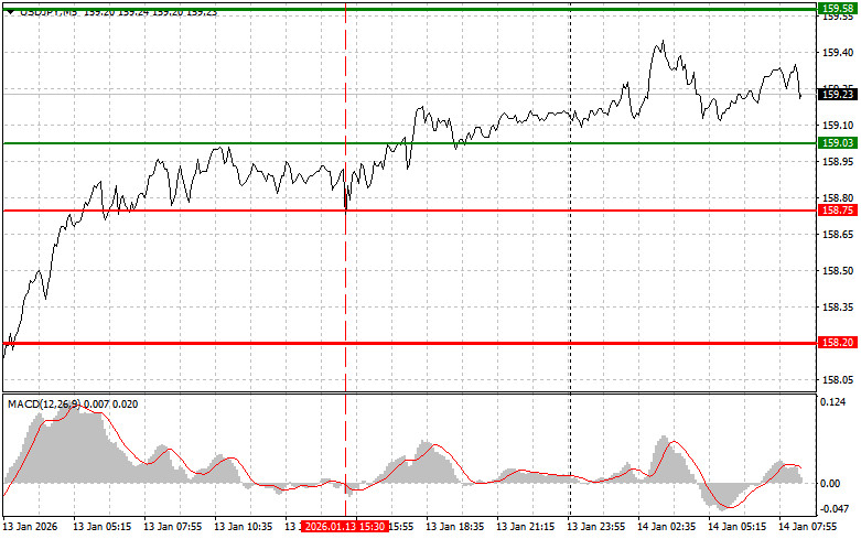 Разбор сделок и советы по торговле японской иенойТест цены 158.75 совпал с моментом, когда индикатор MACD только начинал движение вниз от нулевой отметки, что привело к точке входа на продажу доллара. Однако по сделке были зафиксированы убытки, так как падения пары не состоялось.Декабрьский рост инфляции в Соединенных Штатах, составивший 0,3%, превзошел ожидания аналитиков, что привело к укреплению доллара и падению японской иены далее по тренду. Инвесторы, ожидания которых склонялись к более умеренному росту цен, начали пересматривать свои прогнозы относительно будущей