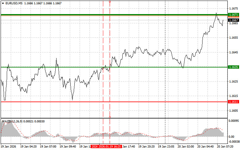 Разбор сделок и советы по торговле европейской валютойПервый тест цены 1.1635 пришелся на момент, когда индикатор MACD много прошел вверх от нулевой отметки, что ограничивало восходящий потенциал пары. Второй тест 1.1635 совпал с моментом нахождения MACD в области перекупленности, что привело к реализации сценария №2 на продажу, однако до падения евро дело так и не дошло.Уже сегодня утром доллар продолжил падение на фоне обострения геополитической ситуации вокруг Гренландии. Неожиданное предъявление территориальных претензий США к стратегически важному острову спровоцировало волну неопределенности.