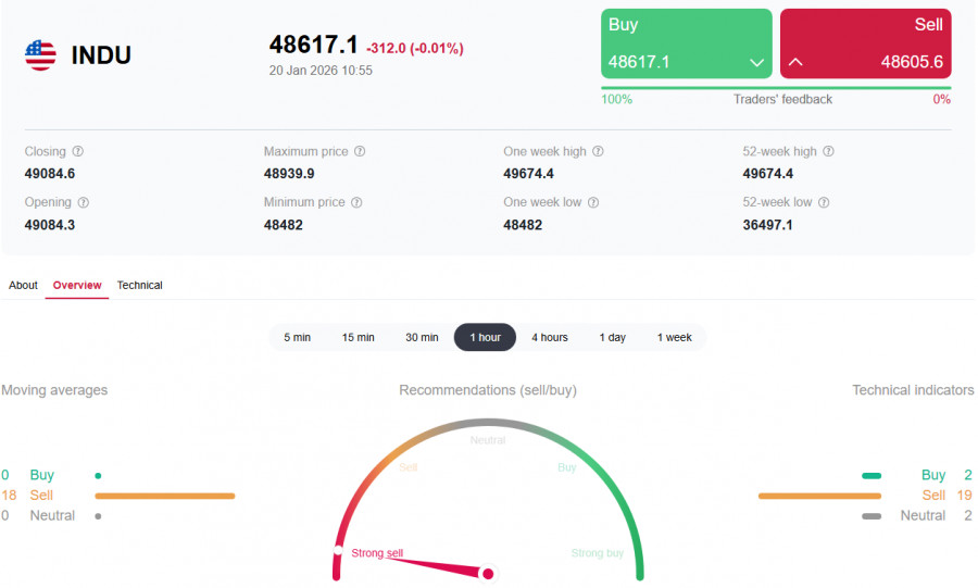 *) см. также: Торговые индикаторы InstaForex по DJIA (INDU) Американский фондовый рынок начал 2026 год под давлением усиливающейся геополитической и торговой неопределённости. Индексы DJIA, S&P500 и NASDAQ100 демонстрируют коррекционную динамику после обновления исторических максимумов в декабре. Основными факторами давления стали заявления президента США Дональда Трампа о возможном расширении тарифов в отношении стран Европейского союза, а также снижение ожиданий по скорому смягчению монетарной политики ФРС.Эту неделю ключевые индексы США, включая промышленный индекс Доу-Джонса (DJIA), также начали резким падением,