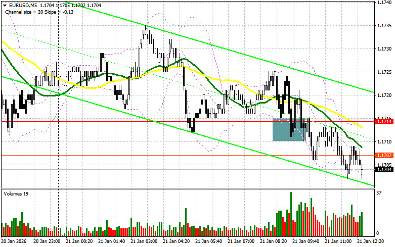 В своем утреннем прогнозе я обращал внимание на уровень 1.1714 и планировал от него принимать решения по входу в рынок. Давайте посмотрим на 5-минутный график и разберемся с тем, что там произошло. Снижение и формирование ложного пробоя в районе 1.1714 привели к точке входа на покупку евро, однако до крупного роста пары дело так и не дошло. На вторую половину дня техническая картина не пересматривалась.Для открытия длинных позиций по EURUSD требуется:Трейдеры проигнорировали сегодняшнее выступление президента ЕЦБ Кристин Лагард, так как