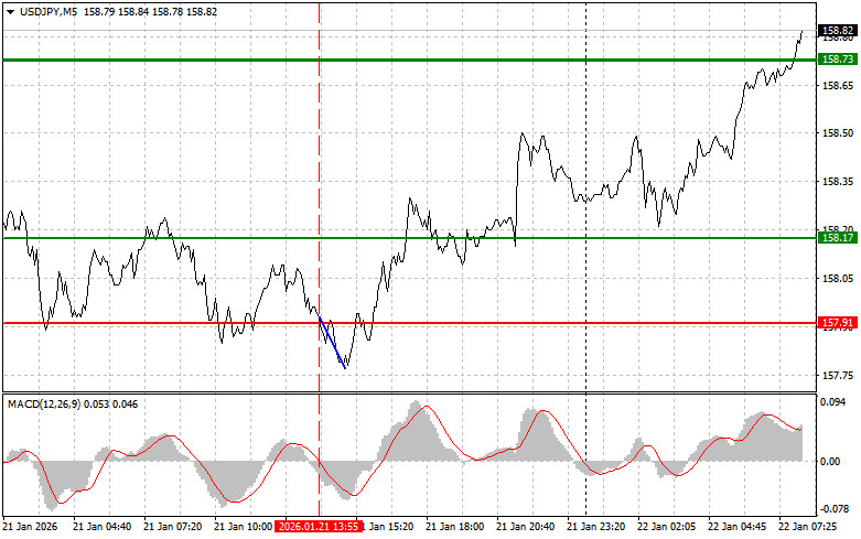 Разбор сделок и советы по торговле японской иенойТест цены 157.91 совпал с моментом, когда индикатор MACD только начинал движение вниз от нулевой отметки, что стало подтверждением правильной точки входа на продажу доллара. В результате пара снизилась лишь на 12 пунктов.Укрепление американской валюты против иены произошло на фоне заявления президента Дональда Трампа об отказе от введения таможенных пошлин. Этому предшествовала результативная встреча с генеральным секретарем Североатлантического альянса, Марком Рютте, в ходе которой были заложены основы будущего соглашения, касающегося Гренландии. Хотя подробности