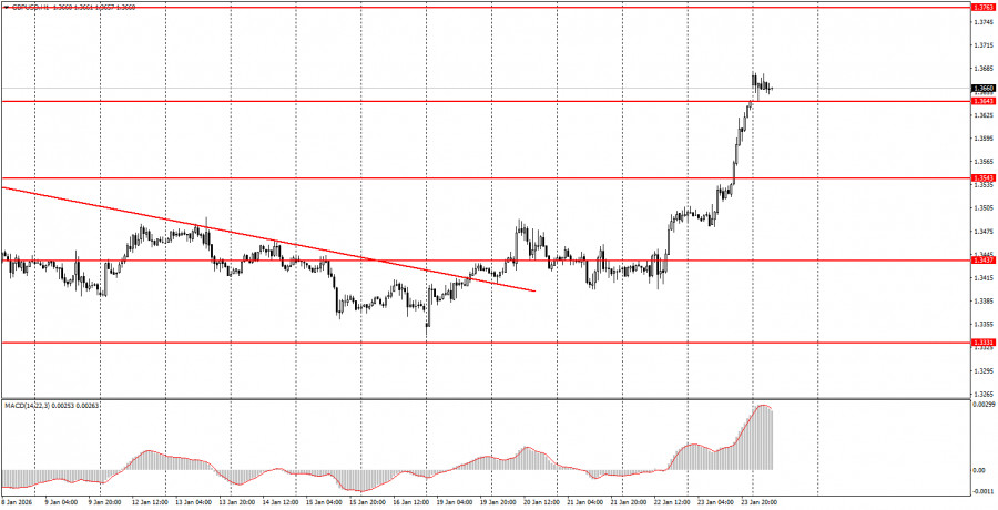 Разбор сделок пятницы: 1Н график пары GBP/USD. Пара GBP/USD в течение пятницы также показала сильное восходящее движение, основной которого стал фундаментальный фон. Напомним, что на прошлой неделе напряжение вокруг Гренландии и возможной новой торговой войны между США и ЕС достигло своего апогея. Трамп грозился либо забрать остров силовым методом, либо ввести против некоторых стран Европы дополнительные тарифы 10%. Однако в среду ситуацию удалось разрешить на экономическом форуме в Давосе. Генсек НАТО Марк Рютте предложил Трампу решение