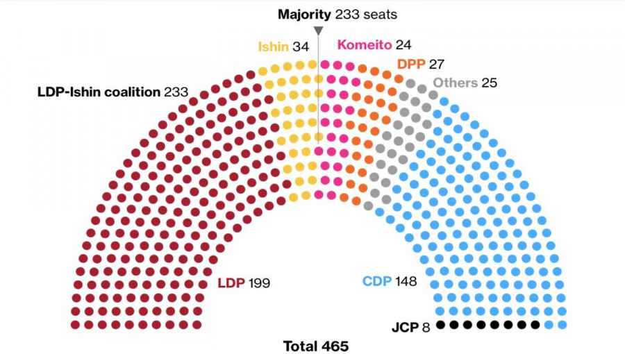 Неосторожность Санаэ Такаити, укрепление американского доллара и широкий дифференциал ставок долговых рынков США и Японии направляют USD/JPY к лучшей недельной динамике с октября. Страна готовится к выборам в нижнюю, наиболее влиятельную палату парламента, известную как Сейм. В ней 465 кресел, Либерально-демократическая партия в коалиции с Ишин имеет большинство – 233. При этом вера инвесторов в успех ЛДП открывает дверь для Такаити-торговли. Структура японского СеймаДолгое время правительство предпринимало титанические усилия, чтобы приструнить «быков» по USD/JPY. И когда у него наконец это