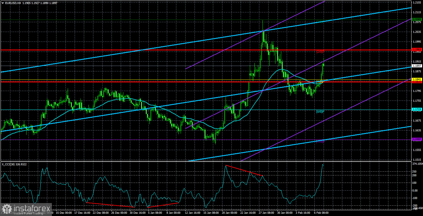 Средняя волатильность валютной пары EUR/USD за последние 5 торговых дней по состоянию на 10 февраля составляет 65 пунктов и характеризуется, как «средняя». Мы ожидаем движение пары между уровнями 1,1831 и 1,1961 во вторник. Старший канал линейной регрессии направлен вверх, что указывает на дальнейший рост евровалюты. Индикатор CCI зашел в область перекупленности, что предупреждает о возможном новом откате вниз.