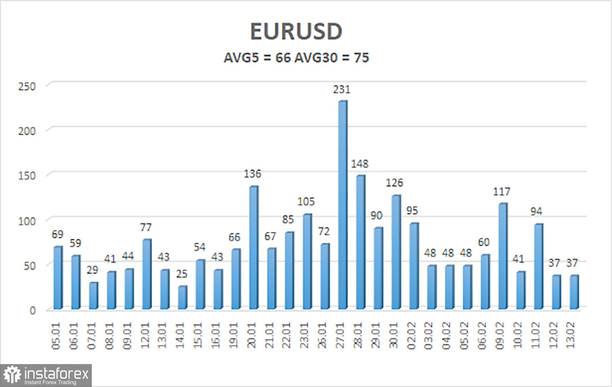 Средняя волатильность валютной пары EUR/USD за последние 5 торговых дней по состоянию на 15 февраля составляет 66 пунктов и характеризуется, как «средняя». Мы ожидаем движение пары между уровнями 1,1802 и 1,1934 в понедельник. Старший канал линейной регрессии направлен вверх, что указывает на дальнейший рост евровалюты. Индикатор CCI заходил в область перекупленности, что предупредило о возможном откате.